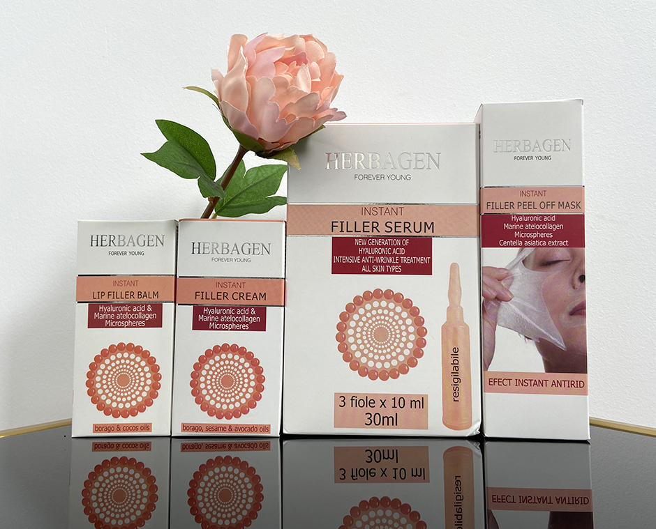 Ținând cont de toate acestea, HERBAGEN (www.herbagen.ro), producător român de cosmetice, a lansat gama Instant Filler cu microsfere cu acid hialuronic. Este o gamă ale cărei produse conțin microsfere deshidratate cu acid hialuronic. Ce fac aceste microsfere deshidratate? Au capacitatea de a pătrunde adânc în piele, de a penetra straturile superioare ale epidermei și, acolo unde au ajuns, au capacitatea să absoarbă apa și, în acest fel, își cresc foarte mult volumul. Și, pe măsură ce se umflă, ridurile sunt atenuate, pentru că pielea se ridică de la interior spre exterior. Se umplu ridurile, cumva. Această gamă conține un ser, o cremă, un balsam pentru buze și o mască. Aceste produse conțin, pe lângă acid hialuronic, și colagen marin, conțin o serie întreagă de uleiuri, de susan, de borago, de avocado, de cocos și câte și mai câte. Sunt ingrediente care au un rol emolient, hidratant, antioxidant, regenerant, antirid.
